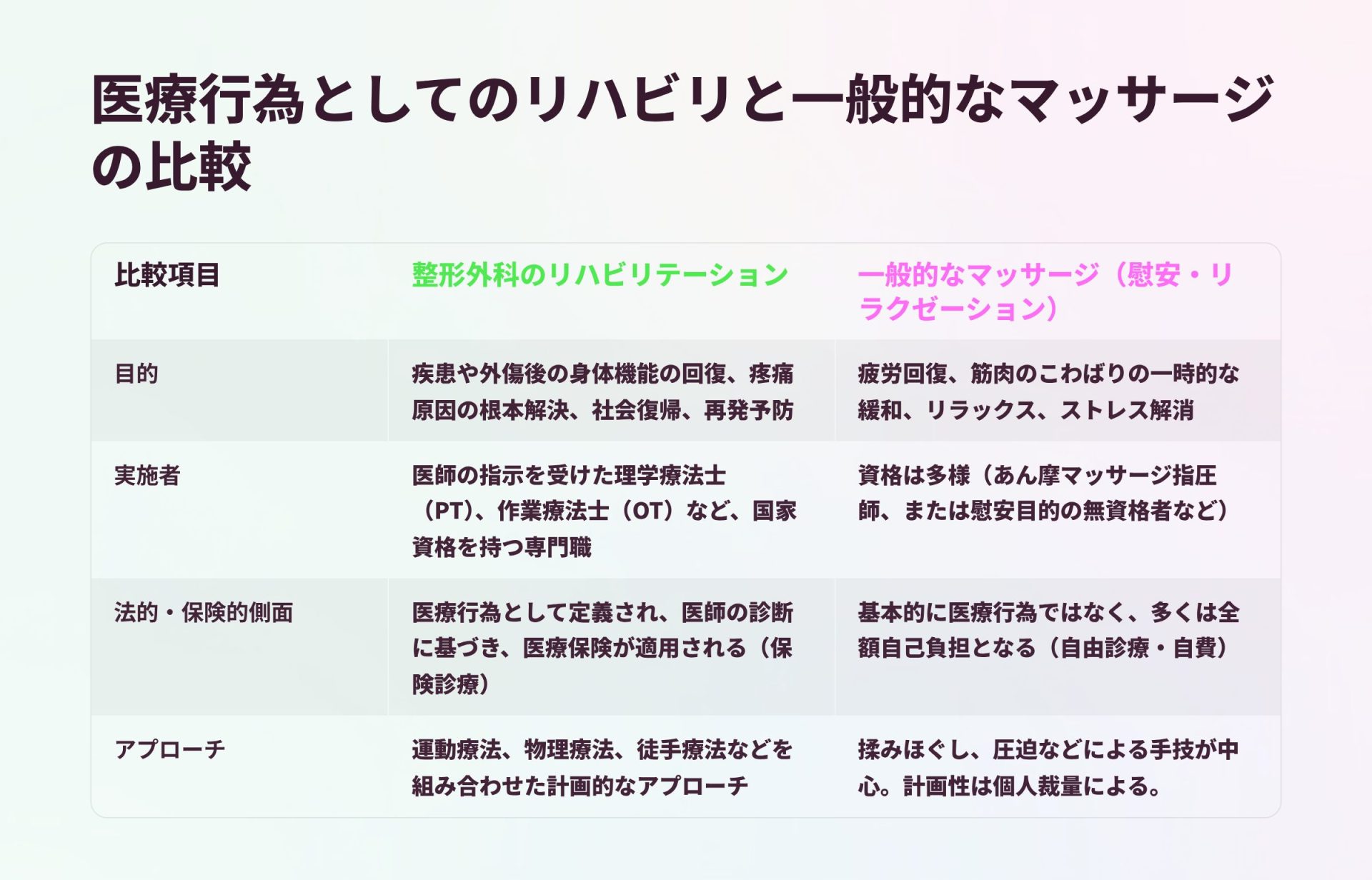 一方、整形外科のリハビリテーションは、明確な医師の診断に基づき、失われた機能の回復、疼痛の原因となっている根本的な病態の治療、そして再発予防を目指す「治療」行為です。